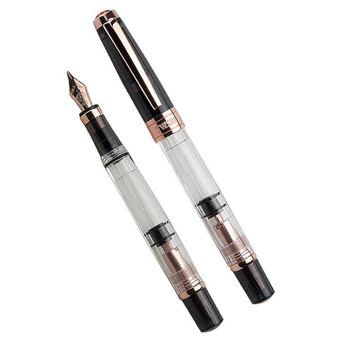 Two Diamond 580 (Smoke/Rose Gold) fountain pens, one capped and one uncapped, showcasing the clear barrel, rose-gold trim, and visible piston mechanism.