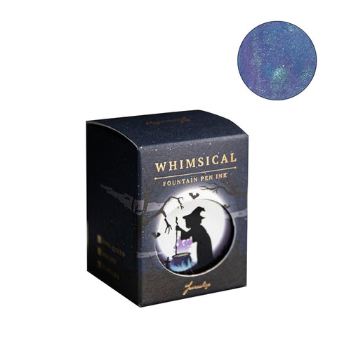 Journalize Elphaba (Shimmer) fountain pen ink, 30ml. Box features a witch stirring a cauldron; ink swatch is shimmery blue-purple with green sparkles. Part of 'Whimsical' collection.