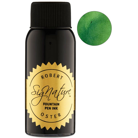Robert Oster Signature Ever Green - 50ml fountain-pen ink bottle with an inset showing the green ink swatch featuring a purple sheen.