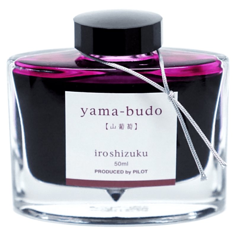 Iroshizuku Ink 50ml - Yama Budo, a 50ml bottle, showcases Pilot's deep purple fountain-pen ink with a sleek rectangular design and branded labeling.