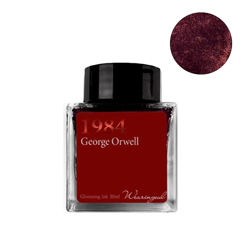 Wearingeul 1984 (Shimmer) - 30ml fountain pen ink in a glass bottle, featuring deep burgundy-red with metallic shimmer, inspired by classic literature. Sold Out