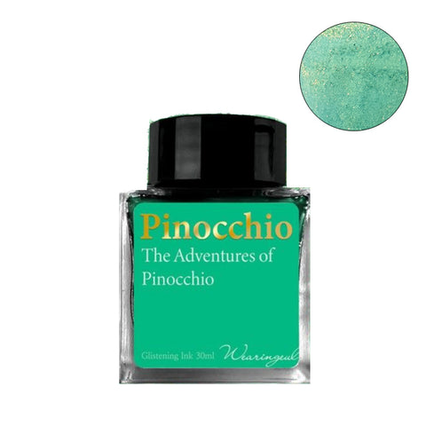 Wearingeul Pinocchio 30ml fountain pen ink in a square glass bottle, featuring shimmering turquoise-green color, inspired by classic literature and suitable for various pens.