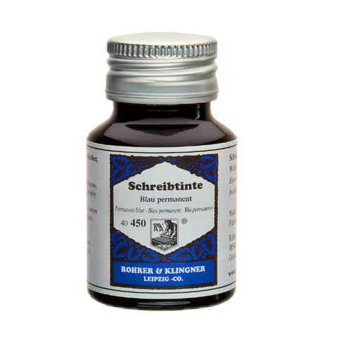 Blau Permanent - 50ml bottle of Rohrer & Klingner writing ink, labeled in German, for fountain or dip pens, hand-produced in Leipzig.