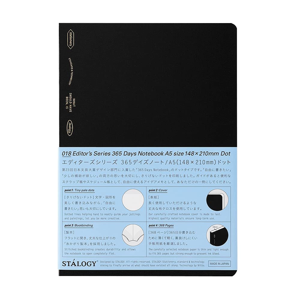 new Stalogy 018 Editor’s Series 365 Days Dotgrid Notebook (A5, Black), featuring 368 pages, light blue band, fountain pen friendly dot-grid paper, ideal for personalized planning.