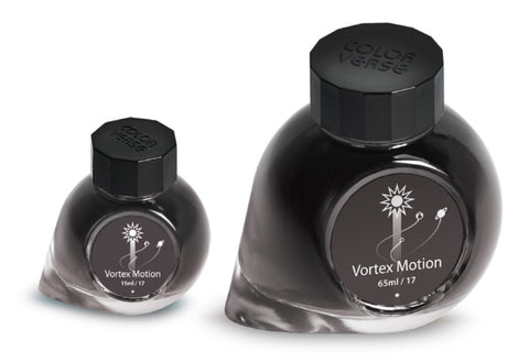 Vortex Motion - 65ml + 15ml Set features two distinctive bulb-and-spiral glass bottles of black fountain-pen ink with black screw-caps from Colorverse's Astrophysics Collection.