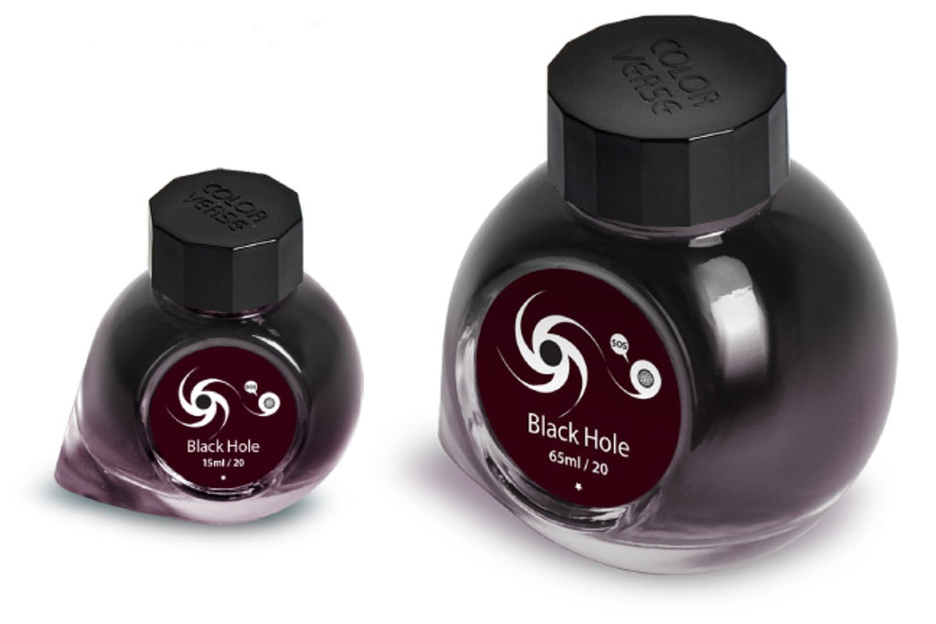 Two glass bottles of Colorverse Black Hole ink, 65ml and 15ml, with octagonal caps and galaxy swirl labels, from the Astrophysics Collection.
