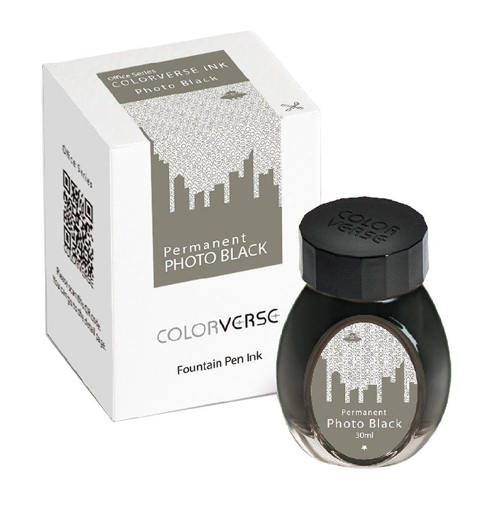 30ml bottle of Colorverse “Permanent Photo Black” fountain-pen ink with city-skyline label, next to its matching packaging box, part of the Office Series.