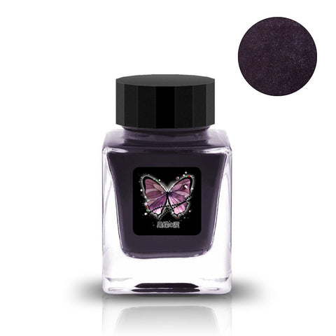 Tono & Lims Black Butterfly Tears, 30ml fountain pen ink, in a square glass bottle with a black cap and purple butterfly label, showcasing its shimmering purple hue. Sold Out