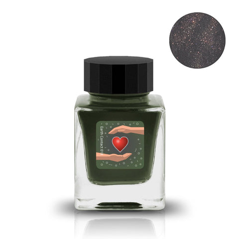 new Blood Stone (Shimmer) - 30ml fountain pen ink by Tono & Lims in a square glass bottle, featuring a label with hands holding a heart and coppery sparkles.