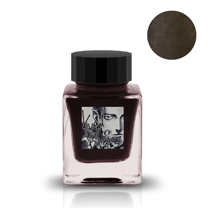 Tono & Lims Kugelblitz fountain pen ink, 30ml, in a square glass bottle with a black cap and manga-style label, showing deep brown/charcoal color.