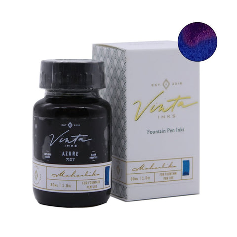 30 mL glass bottle of Vīāta Inks Azure (Maharlika 7107) with a branded box, showcasing fountain-pen ink from the Philippines.