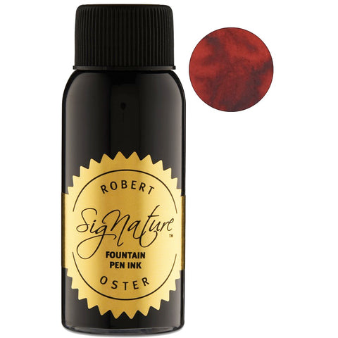 Bottle of Robert Oster “Signature” fountain-pen ink, Australian Syrah - 50ml, with a gold label and a circular swatch of deep burgundy/red ink. Sold Out