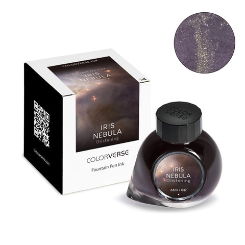 Colorverse Project Ink No.037 Iris Nebula (Glistening) fountain pen ink, 65ml, with matching box and swatch showing its iridescent shimmer.
