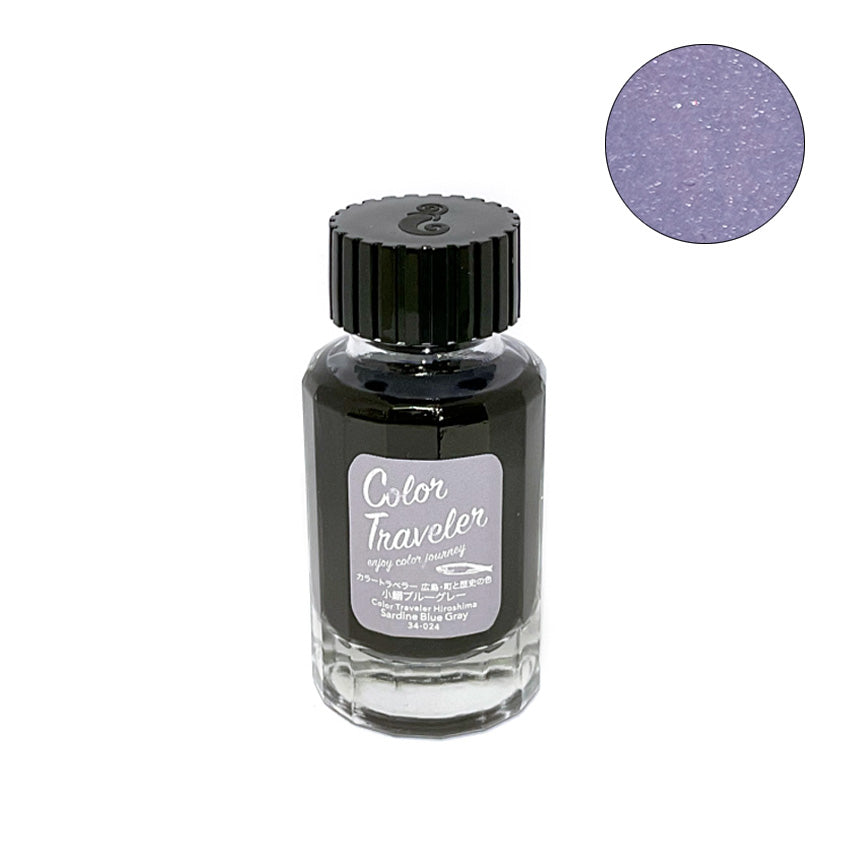 Color Traveler Sardine Blue Gray (Shimmer) fountain pen ink, 30ml glass bottle, with a blue-gray and purple tone. Includes mini bottle, stickers, dropper, and brochure.