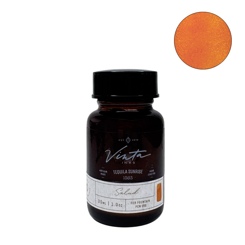 new Vinta Inks Tequila Sunrise (Salud 1565) fountain pen ink, 30ml amber-glass bottle, showcases a bright orange hue with gold shimmer from the Summer Cocktails collection.