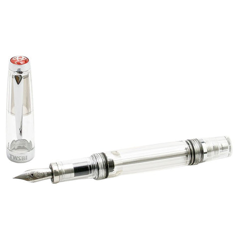 VAC Mini (Clear) - Broad, a TWSBI fountain pen with a transparent body, showcasing the vacuum system and steel nib; cap removed and placed beside the barrel.