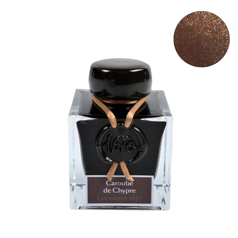 Jacques Herbin Caroube de Chypre fountain pen ink, 50ml, from the 1670 Collection, in a square glass bottle, showcasing shimmery brown shade. Sold Out