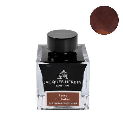 new Jacques Herbin Brun Prevenance fountain pen ink, 50ml bottle, dark brown with watercolor-like texture, showcasing subtle brush patterns.
