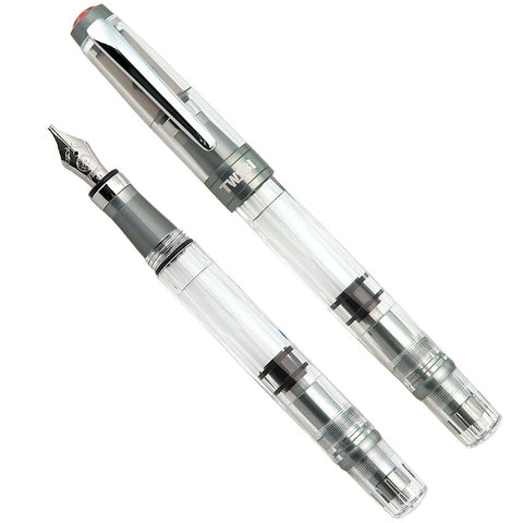 ECO-T (Clear) - Medium fountain pen with transparent barrel and cap, showcasing the internal piston-filling mechanism and a metal nib, designed for enhanced grip technique.