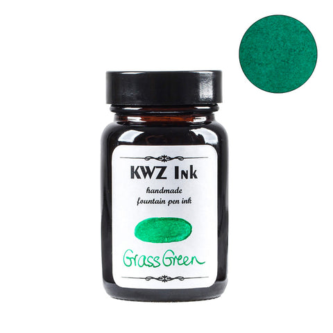 KWZ Ink's Grass Green fountain pen ink, 60ml bottle, showcases bright green hue on label and sample. Handmade, dye-based ink from Desk Bandit's curated collection.