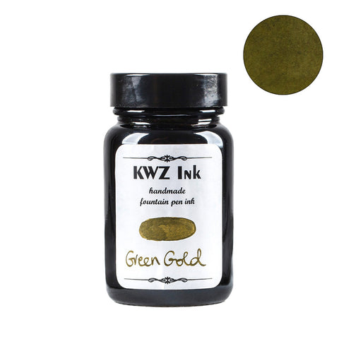 KWZ Ink Green Gold 60ml fountain pen ink in a black glass bottle with white label, showcasing a unique green-gold shade swatch.