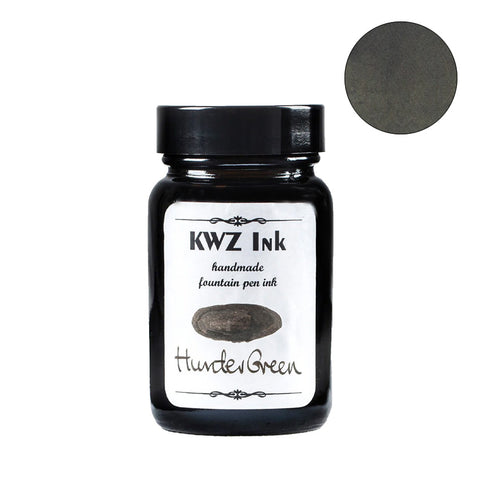 KWZ Ink's Hunter Green - 60ml bottle of handmade fountain pen ink, showcasing its rich dark green hue with a color swatch in the corner.