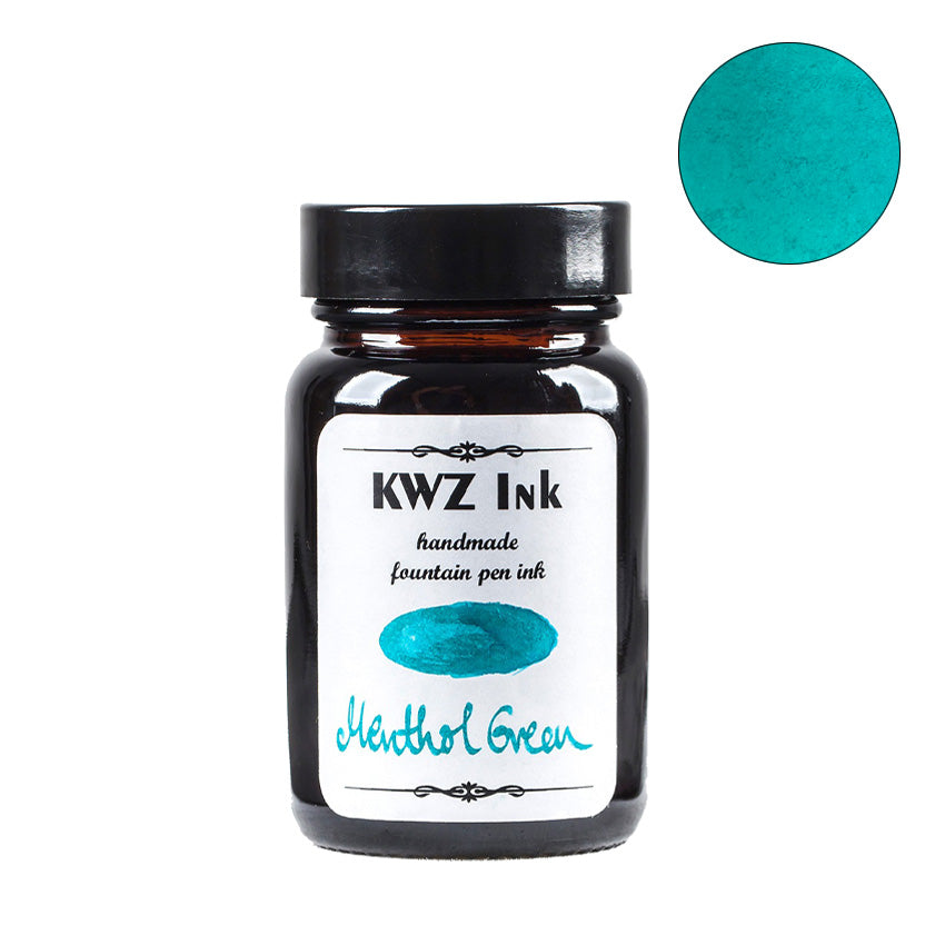 KWZ Ink's Menthol Green fountain pen ink in a 60ml amber-glass bottle, featuring a teal-green swatch preview.