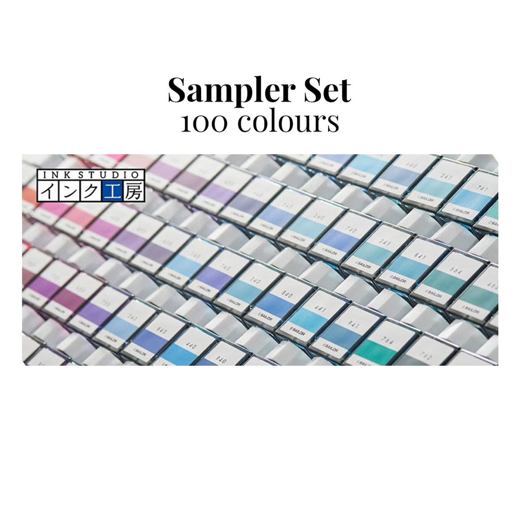 Ink Studio Sampler Set - 100 colours displayed in neat rows, each swatch labeled, showcasing Sailor's curated ink shades from the Ink Studio line.