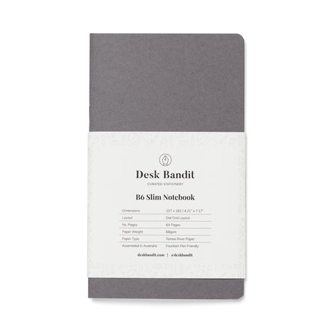 Japanese-Milled 64gsm Notebook - B6 Slim (Dot Grid) with dark gray soft cover, white paper band, and 64 pages of fountain pen friendly paper.