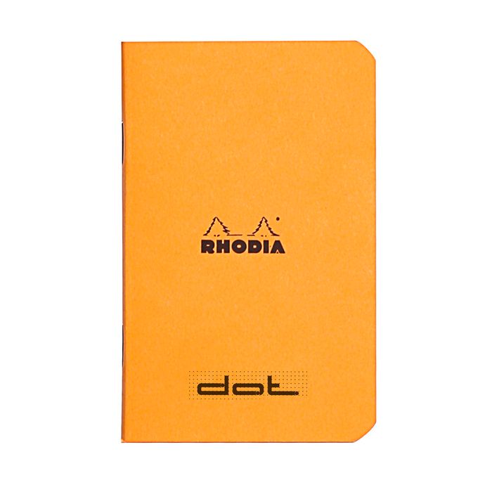 Rhodia Cahier A7 Notebook (Dot Grid) with iconic orange cover, features 48 fountain pen friendly pages, ideal for creative sketches and notes.