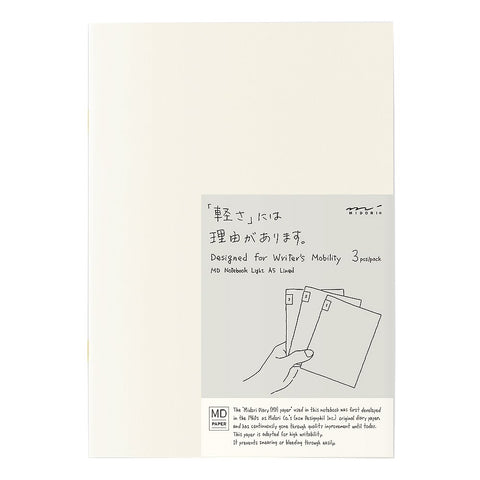 MD Notebook Lite - A5 Lined/Ruled (3 pack) with off-white covers, yellow staples, and Japanese-English text highlighting lightweight design and high-writability MD paper.