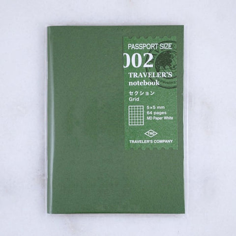 Traveler’s Company #002 Grid (Passport) refill notebook with forest-green cover, featuring 64 MD white paper pages in a 5x5mm grid layout.