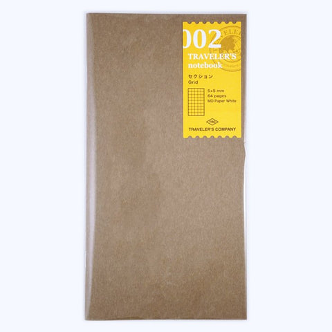 #002 Grid Refill (Regular) for Traveler's Notebook, slim kraft-paper-covered notebook with 64 pages of 5x5 mm grid MD white paper, in original plastic sleeve.