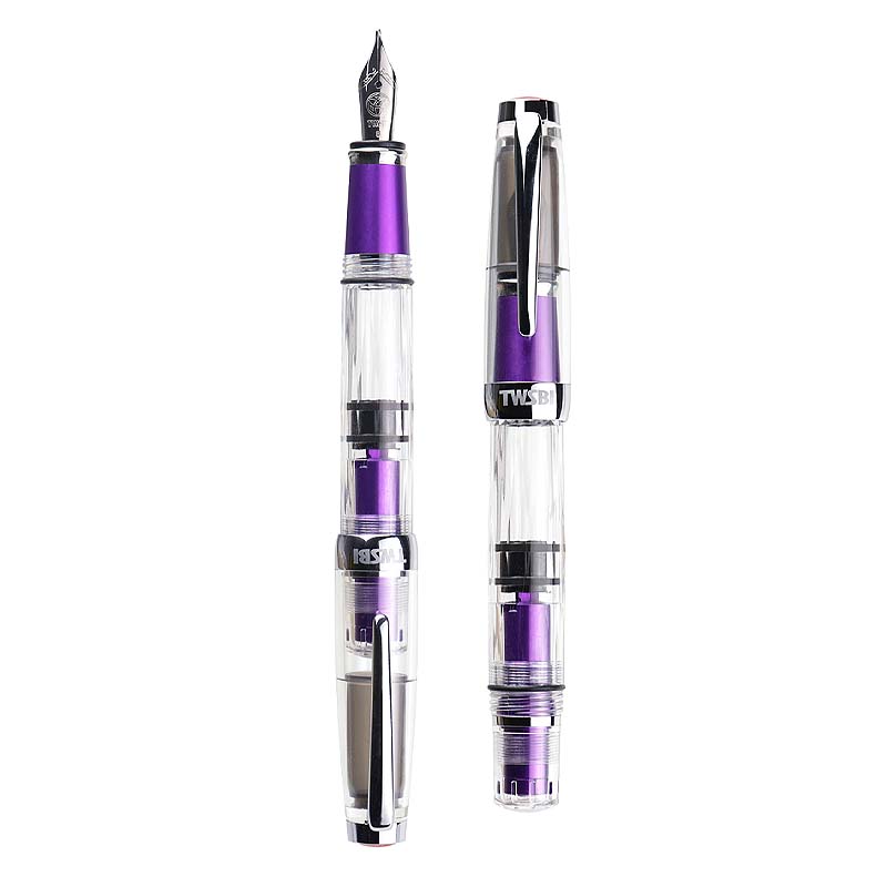 ECO (Transparent Purple) - Medium fountain pen, uncapped showing steel nib and piston mechanism; capped view highlights purple cap with metal clip and clear reservoir.